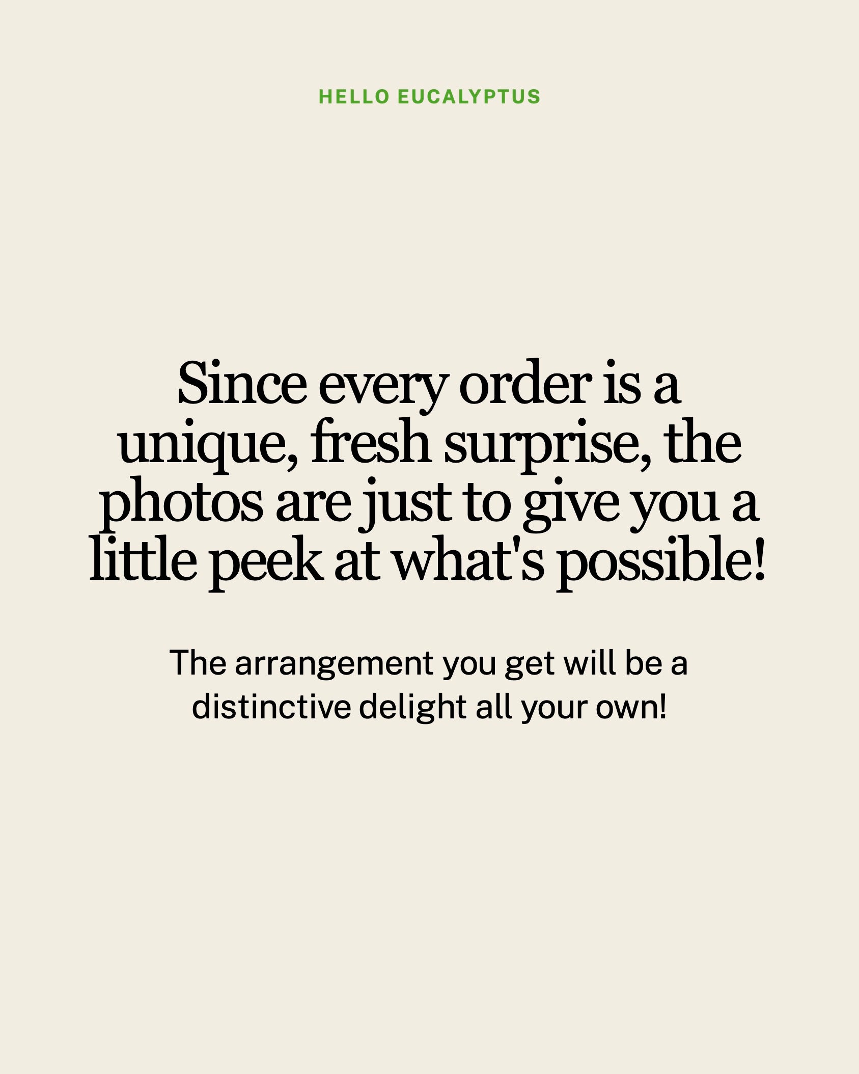 Please note: The photos shown are examples of previous bouquets and do not represent the exact arrangement you will receive. Each order includes a prearranged bouquet with a unique selection of seasonal flowers, ensuring a fresh and distinctive experience every time.